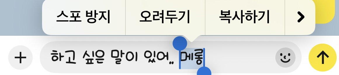 1. 카카오톡 채팅방에서 메시지를 입력합니다. 바로 전송하지 마시고요. 전송하기 전에 가리고 싶은 부분을 1초 정도 길게 눌러주세요.